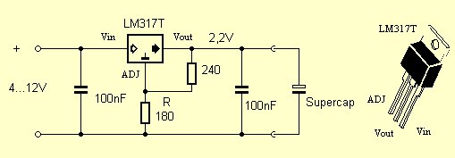 Durch Anpassung des Widerstands R kann auch eine andere Spannung eingestellt werden. Mit R = 240 Ohm ergibt sich eine Ausgangsspannung von 2,5 V. Vor dem Anschluss eines Supercap sollte man die Ausgangsspannung messen, um Fehler zu vermeiden. |