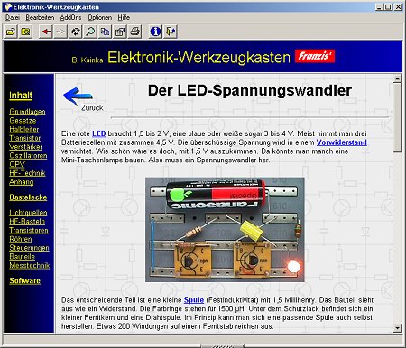 Die einzelnen Bauprojekte aus der "Bastelecke" auf der Homepage des Autors wurden mit zahlreichen Links ausgestattet. Wer z.B. den LED-Spannungswandler aufbauen möchte und nicht so recht weiß, was er mit dem Begriff "Vorwiderstand" anfangen soll, der braucht nur einen Mausklick, um in das entsprechende Kapitel mit der Theorie und den Berechnungsgrundlagen zum Thema zu gelangen.
