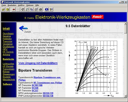 Datenblätter findet man im Internet. Aber das kostet Zeit. Oft ist gerade die Vielfalt ein Hindernis bei der Suche. Auf der CD findet sich eine Auswahl der wichtigsten Datenblätter. Hier lohnt es sich zu stöbern. Die wichtigsten Gruppen aktueller Bauteile von Transistoren über Operationsverstärker bis zu Mikrocontrollern und Peripheriebausteinen sind vertreten. Die Datenblätter selbst enthalten vielfach auch Schaltbilder und Anwendungsbeispiele.
