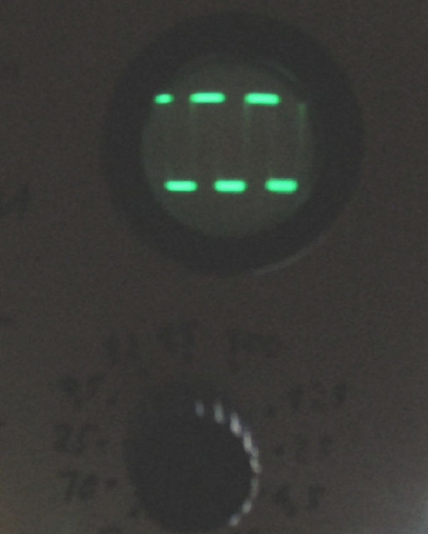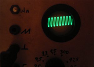 Das Gerät ist etwas verstaubt, funktioniert aber immer noch. Die technischen Daten sind eher bescheiden. Die Bandbreite beträgt vielleicht 1 MHz, es gibt nur AC-Kopplung über einen Eingangskondensator. Die interne oder externe Synchronisierung kommt nicht an die heute übliche Triggerung heran, liefert aber stehende Bilder. Die Ablenkung wurde nicht in µs und ms eingestellt, sondern in Hz und kHz. Der Regler unten rechts ist die Feineinstellung der Ablenkfrequenz. Links ist ein Poti für die Eingangsempfindlichkeit, in der Mitte kann man die Helligkeit einstellen. Das Gerät hat einige Jahre lang seinen Dienst verrichtet und war besser als nichts, denn wie Ing. Dietrich Drahtlos schon gesagt haben soll: Was im Labor niemals fehlen darf, ist der Kathodenstrahloszillograf.