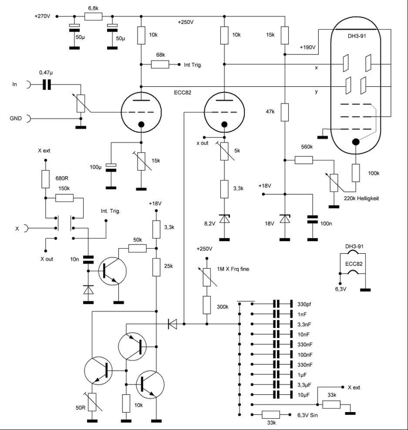 Der Y-Verstärker sieht ganz ähnlich aus wie die Vorstufe eines typischen Audioverstärkers. Der Kathodenwiderstand muss so eingestellt werden, dass die Anodenspannung ohne Aussteuerung 190 V beträgt und der Strahl mittig steht. An der Anode wird auch das verstärkte Signal für die interne Triggerung ausgekoppelt.