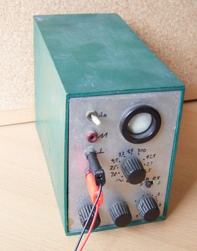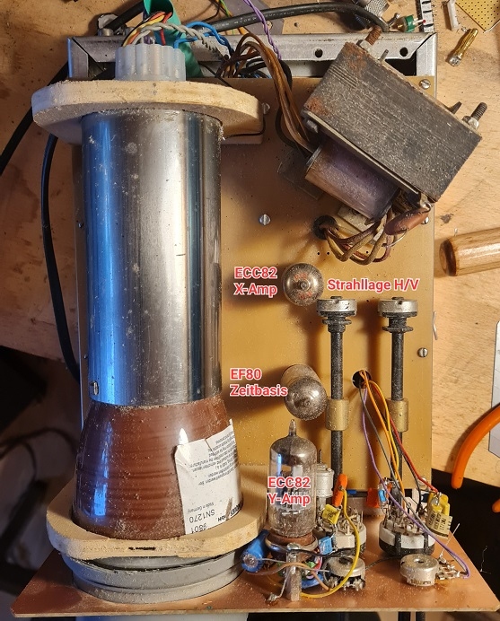 Das Innenleben zeigt, dass eine Röhre (ECC82) für die beiden Ablenkverstärker benutzt wurde. Damals waren nämlich Transistoren für hohe Spannung noch nicht so verbreitet, aber Röhren gab es in jedem kaputten Fernseher. Die Sägezahnschaltung mit Synchronisierung war aber mit Transistoren aufgebaut. Das Gehäuse habe ich aus Sperrholz gebaut und grün lackiert.
