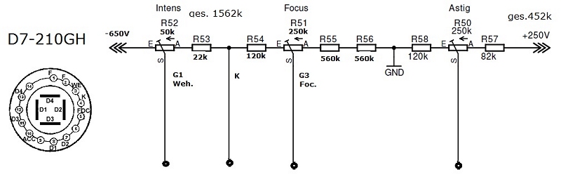 Je nach dem im Grunde recht geringen Strombedarf der Hochspannung in der Bildröhre kann man die Widerstände recht einfach berechnen, es ist nur etwas Fleißarbeit. Etwa 1-2 Kilo-Ohm pro Volt kann man veranschlagen. Dann nimmt man sich das Datenblatt zu Rate und berechnet zuerst die veränderbaren Spannungen für G1/Wehnelt, Fokus etc, und daraus die Größe der Potentiometer. Nimmt man z.B. 2 kOhm/Volt und ist der Bereich für Fokus z.B. mit 50-150 Volt gegen Kathode angegeben, dann ist die Differenz 100 Volt und somit das Poti 200 kOhm, man nimmt dann 250 k und berechnet den restlichen Widerstand bis zur nächsten Anode, Gitter oder Kathode und nimmt bei krummen Werten eine Kombination aus kleineren Festwiderständen. Fehlt nur noch der Punkt, wo man die Masse in der Widerstandskette anschließt. Dabei sieht man wieder ins Datenblatt und schaut nach den Betriebswerten der Ablenkplatten und deren erlaubter Spannung gegen die nächste(n) Gitter/Anode(n). Daraus berechnet man dagegen dann den Wert, der aus den Ablenkstufen kommt, sodass die Transistoren oder Koppelkondensatoren keine "unangenehmen" Spannungen zu überwinden haben.