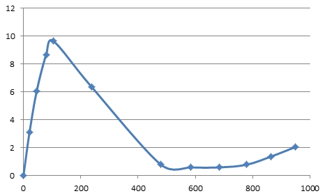 Beim Versuch, eine genau Kennlinie zu messen, kam dies heraus. Das