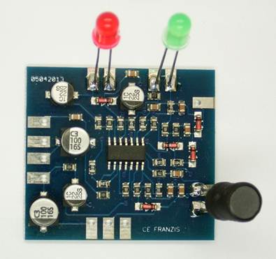 Der zweite Endverstärker dient zur Ansteuerung der beiden Signal-LEDs und hat eine zehnfach größere Verstärkung (100-fach). Die rote LED (Level 1) wird direkt mit dem Ausgangssignal angesteuert und zeigt deshalb auch kurze Impulse. Auch beim Einschalten und beim Ausschalten des Geräts sowie beim Umschalten zwischen magnetischer und elektrischer Messung entsteht hier jeweils ein kurzer Lichtblitz. Für die grüne LED (Level 2) gibt es einen Signalgleichrichter mit Glättungskondensator. Sie leuchtet daher erst bei höheren und konstanten Pegeln. Wegen der LED-Schwellspannung von ca. 2 V gibt es jeweils einen Mindestpegel bei dem eine LED zu leuchten beginnt. Eine solche Schwelle gibt es für den Lautsprecher nicht, sodass schwache Signale schon hörbar werden wenn die LEDs noch nicht leuchten.