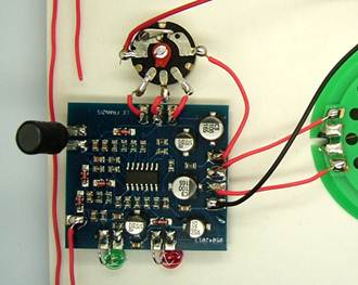 Die Platine sollte nun parallel zum Gehäuse zwischen Poti und LEDs stehen. Zwei weitere kurze Drähte von 4 cm stellen die Verbindung von LS+ und LS- zum Lautsprecher her. Damit wird die Platine von drei Seiten gehalten.