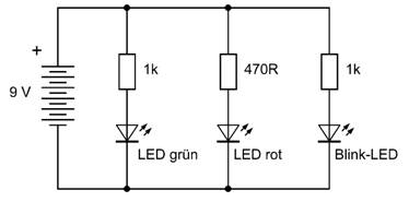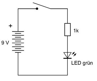 Das Schaltbild zeigt eine Reihenschaltung. Der Strom fließt durch Batterie, Widerstand und LED. Der Widerstand hat dabei die Aufgabe die Stromstärke auf einen sinnvollen Wert zu begrenzen. Je größer der Widerstand, desto kleiner die Stromstärke. Bei 1 kΩ wird die LED zwar noch unterhalb ihres maximal erlaubten Stroms betrieben, sie leuchtet aber schon recht hell.