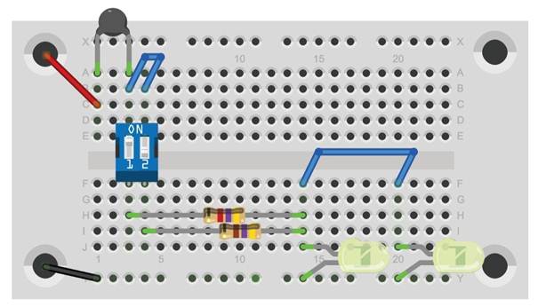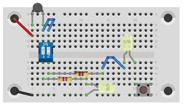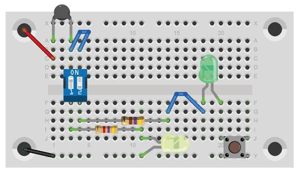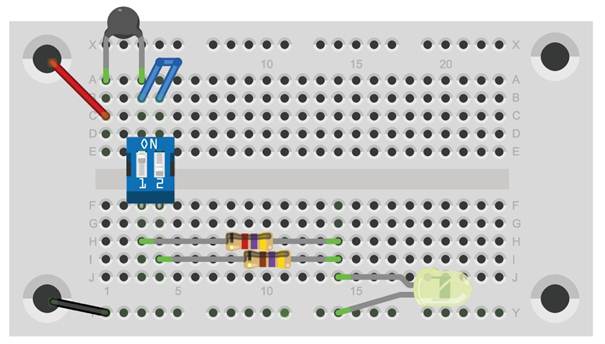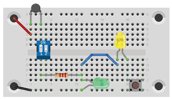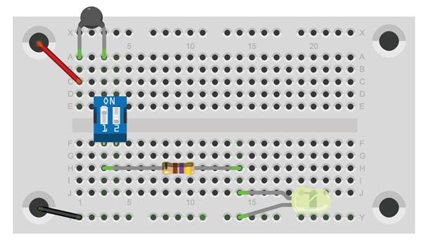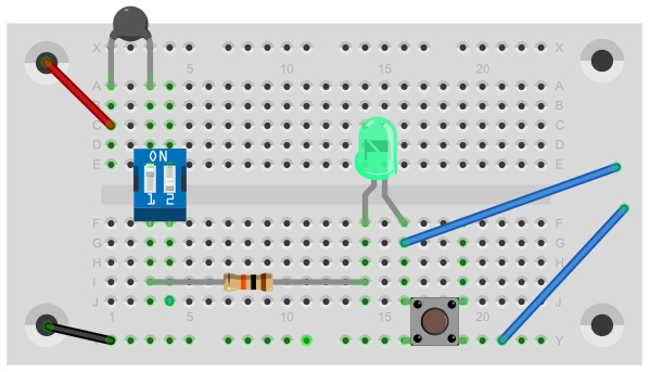 Achtung. Du musst den Schalter bei jedem Schalten festhalten, damit er nicht aus der Steckplatine rutscht.