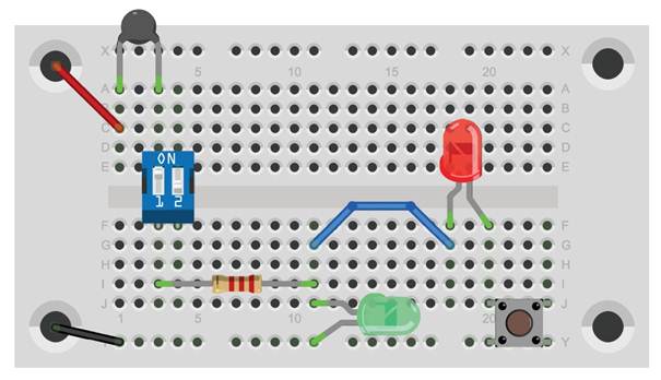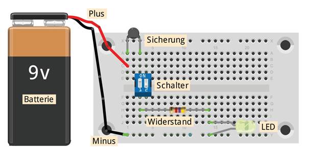 Die Sicherung ist ein Bauteil mit zwei Drähten und steckt in den beiden Löchern 1A und 3A. Wie sie funktioniert, wird noch erklärt. Und der Schalter sitzt in der Mitte zwischen E3, E4 und F3, F4. Diese Bauteile behalten bis zum letzten Versuch ihre Position und müssen nie mehr herausgenommen werden.