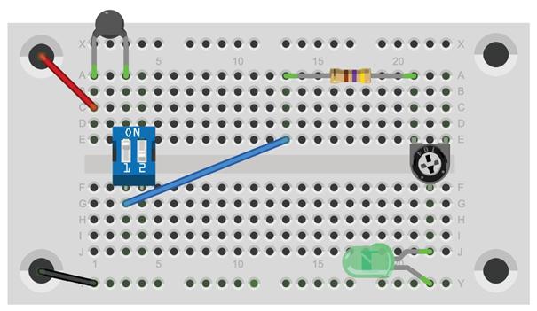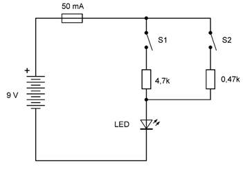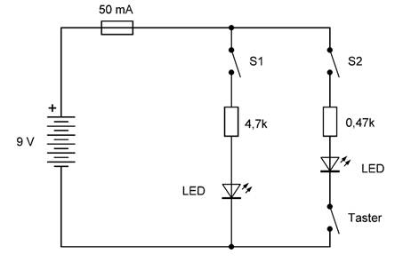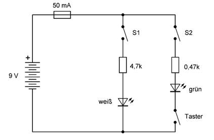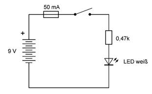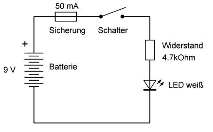 1. Steckplatine, Batterieclip, Schalter, Sicherung, LED weiß, Widerstand 4,7 k