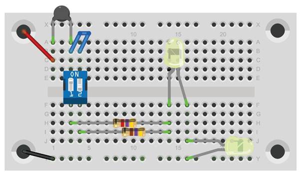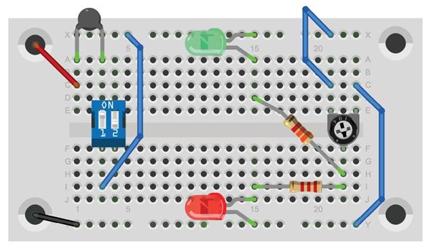 Eigentlich sind es sogar drei Helligkeitsstufen. Schalter 1 ist für die einfache Helligkeit zuständig und Schalter 2 für die zehnfache Helligkeit. Aber wenn beide Schalter an sind, hast du die elffache Helligkeit. Teste es einmal: Schalter 2 ist an, und Schalter 1 wird abwechselnd an- und ausgeschaltet. Der Unterschied ist sehr gering. Kannst du ihn noch erkennen?