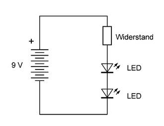 Die Spannung teilt sich auf die Verbraucher im Stromkreis auf. In diesem Fall sind es zwei LEDs und ein Widerstand. Jede weiße LED braucht ungefähr 3 V. Zwei LEDs brauchen also 6 V. Und weil die Batterie 9 V hat, bleibt eine Spannung von 3 V für den Widerstand übrig. In diesem Fall wird also die Batteriespannung zu gleichen Teilen auf drei Verbraucher aufgeteilt. Genauso teilt sich auch der Energieverbrauch auf. Der Widerstand erzeugt nur etwas nutzlose Wärme, aber die LEDs das gewünschte Licht. Weil diesmal nur ein Drittel der Spannung am Widertand liegt, wird auch nur ein Drittel der Energie „verschwendet“. Die Schaltung mit zwei LEDs in Reihe ist also besser als die mit nur einer LED, wo zwei Drittel verloren gehen.