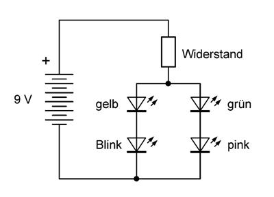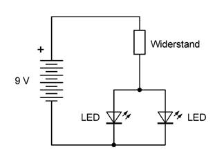 Diesmal hast du eine Parallelschaltung gebaut, die man auch „verzweigter Stromkreis“ nennt. Der Strom durch den Widerstand teilt sich nämlich auf zwei LEDs auf. Die Hälfte des Stroms fließt durch die eine LED, die andere Hälfte durch die andere LED. Ein kleiner Test kann das beweisen: Ziehe einmal das Kabel zwischen beiden LEDs heraus. Eine LED geht dann aus, aber die andere wird heller. Durch sie fließt nämlich nun der ganze Strom.
