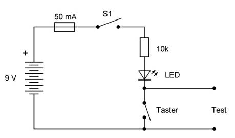 Eine weitere Korrektur am Tag 8: Dank an Mirko Zeibig, der mich darauf aufmerksam gemacht hat, dass der Tastschalter im Aufbaubild falsch angeschlossen war. Hier nun die Berichtigung: 8 Ein elektrisches Testgerät