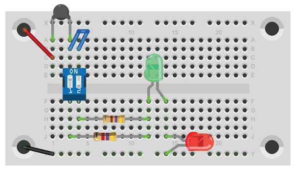 Öffne das Türchen Nummer 10 und nimm einen Widerstand mit 2,2 kΩ (Rot, Rot, Rot) heraus. Diesmal soll eine ganz besondere Schaltung gebaut werden, ein Grün/Rot-Umschalter. Immer wenn du auf den Taster drückst, geht die rote LED an, aber die grüne LED geht aus.