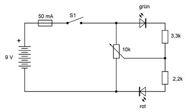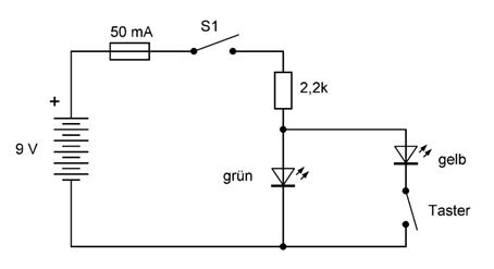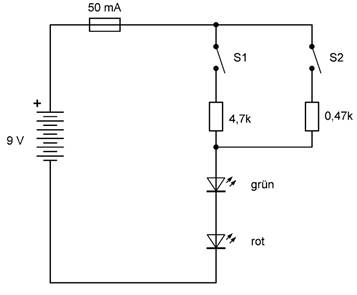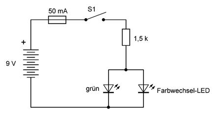 Bei geschlossenem Schaltkontakt ist das eigentlich nur eine ganz normale Parallelschaltung wie am Tag 5. Aber da wurden zwei gleiche LEDs verwendet, diesmal sind es zwei ganz verschiedene. Die grüne LED braucht eine größere Spannung als die rote LED. Wenn du die rote LED einschaltest, sinkt die Spannung so weit ab, dass die grüne LED nicht mehr leuchten kann. Und so entsteht tatsächlich eine Umschaltung der Farben.