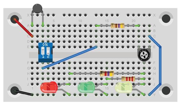 Alle Bauteile werden in die passenden Löcher der Steckplatine gesteckt. Das ist manchmal nicht ganz einfach und erfordert viel Geschick. Nimm am besten eine kleine Flachzange und setze die Drähte genau von oben ein. Achte auf die richtige Position der Anschlüsse.