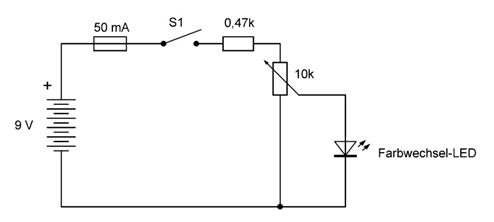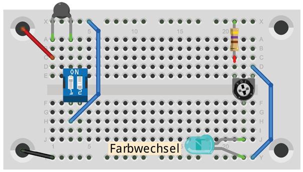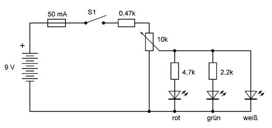 Die Farbwechsel-LED wird gleich beim ersten Versuch mit einstellbarer Helligkeit betrieben. Gleichzeitig kannst du einen weiteren Versuch durchführen. Das Poti wird hier als Spannungsteiler angeschlossen, sodass du auch sehr kleine Spannungen ab null Volt einstellen kannst. Drehe den Knopf ganz langsam nach rechts und erhöhe damit die Spannung. Zuerst wird nur die rote LED flackern. Dann kommt die grüne hinzu. Und erst bei noch größerer Spannung leuchtet auch die blaue LED. Damit hat die die Spannungsreihe der LED-Farben erforscht. Das Ergebnis entspricht dem im Versuch Nr. 13.
