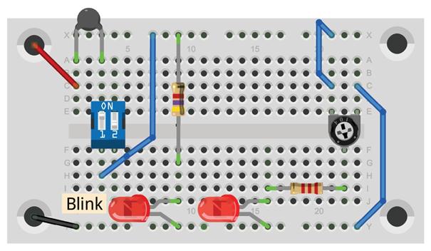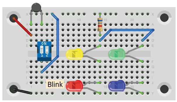 Die Blink-LED enthält einen elektronischen Schalter, der aus einem Transistor besteht. Aber das reicht noch nicht, es sind noch viele weitere Transistoren und andere Bauelemente nötig, die zusammen eine komplexe Schaltung bilden und die Aufgabe haben, den genauen Zeitablauf zu steuern. Alles zusammen ist auf einem sehr kleinen Stück Silizium aufgebaut, der neben dem LED-Kristall eingebaut ist.