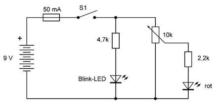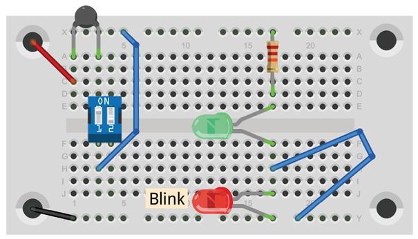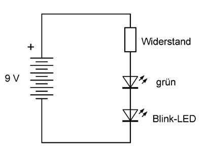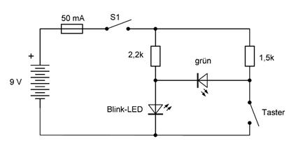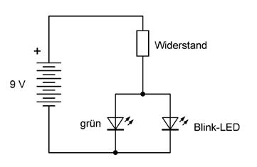 Eine Brückenschaltung besteht aus zwei Reihenschaltungen und einem Bauteil zwischen beiden. Auf der linken Seite enthält die Reihenschaltung einen Widerstand und die Blink-LED. Auf der rechten Seite ist es ein Widerstand und ein Schalter. Zwischen beiden liegt eine LED und bildet die Brücke. Die entscheidende Frage ist nun: Ist die Spannung auf der linken Seite oder auf der rechten Seite höher? Die grüne LED kann nur leuchten, wenn links die Blink-LED gerade angeschaltet ist und rechts der Schalter gerade aus. Nur dann ist nämlich die Spannung rechts größer als links, sodass Strom durch die grüne LED fließen kann.