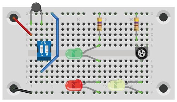 Das elfte Türchen verbirgt eine gelbe LED. Du kannst sie genauso einsetzen, wie die andern Farben. Aber besonders interessant ist die Frage, wie sich die gelbe LED zusammen mit der grünen LED verträgt. Setze deshalb die neue LED anstelle der roten LED in den Aufbau vom letzten Tag ein. Und tatsächlich, jetzt hast du einen Grün/Gelb-Umschalter.