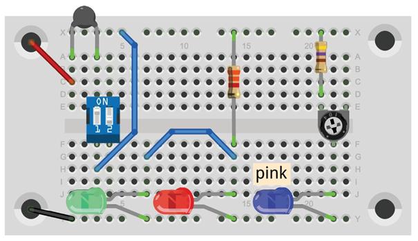 Vertausche einmal die grüne und die pinke LED. Nun blinkt die pinke LED, und die grüne zeigt ein gleichmäßiges leuchten mit einstellbarer Helligkeit. Damit ist es bewiesen: Auch eine pinke LED braucht mehr Spannung als eine rote LED.