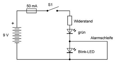 Für diese Alarmanlage wurde ein besonders großer Widerstand mit 22 kΩ verwendet. Das hat einen wichtigen Grund. Eine Alarmanlage muss lange in Betrieb sein. Deshalb ist es wichtig, dass nur wenig Strom fließt. Hier sind es etwa 0,3 mA. Eine neue Batterie mit 2000 mAh könnte die Anlage etwa 6000 Stunden lang betreiben. Das sind mehr als neun Monate. Echte Alarmanlagen sind meist mit dem Stromnetz verbunden. Aber wenn es um ganz wichtige Dinge in einem Museum geht, verwendet man zusätzlich für den Fall eines Stromausfalls noch eine Batterie.