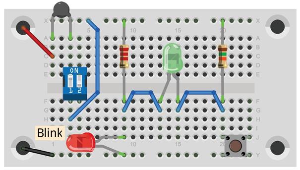 Wenn du den Taster drückst, bleibt die grüne LED aus. Wenn du ihn loslässt, blinkt sie im gleichen Takt mit der roten Blink-LED. Der Taster soll nun immer wieder gedrückt und nur dann kurz losgelassen werden, wenn die Blink-LED gerade aus ist. Wenn man den Zeitpunkt verpasst, blitzt die grüne LED auf. Es kommt auf deine schnelle Reaktion an! Wie oft kannst du den Schalter betätigen, ohne dass die LED einmal aufblitzt? Mache einen Wettbewerb mit deinen Freunden.