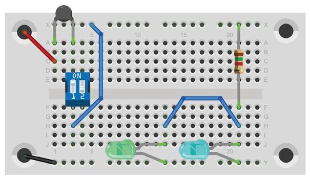 Darf es mal eine andere Farbe sein? Im Fach Nummer 7 findest du eine grüne LED. Baue sie anstelle der weißen Signal-LED ein. Das Licht dieser LED ist über noch größere Entfernungen zu erkennen. Nun kannst du geheime Botschaften mit Freunden austauschen, die sich in Sichtweite befinden.
