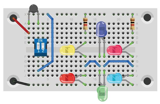 Insgesamt sechs LEDs und nun eingebaut, aber zwei weiße LEDs sind noch ohne Aufgabe. Überlege einmal selbst, wie du sie zusätzlich einbauen könntest. Da gibt es ganz unterschiedliche Möglichkeiten. Schaue dir die anderen Versuche noch einmal an, dann wird dir sicher etwas einfallen. Und auch die anderen Widerstände kannst du noch gebrauchen. Insgesamt hast du nun so viele Bauteile, dass du ganz andere Schaltungen erfinden kannst. Versuch macht klug!