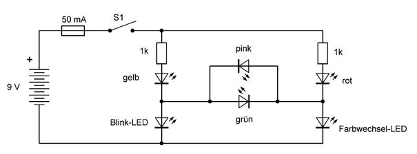 Deine Schaltung besteht auch zwei LED-Reihenschaltungen und einer Brückenschaltung mit zwei gegensätzlich gepolten LEDs. Achte genau auf die Einbaurichtung jeder LED. Falls etwas nicht funktioniert, könnte es daran liegen, dass eine LED falsch herum eingebaut wurde.