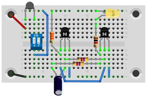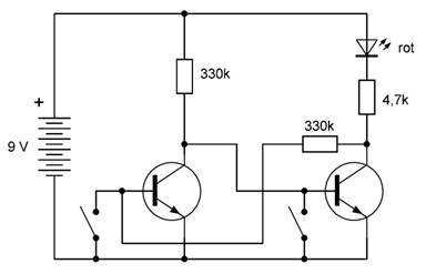 Die Schaltung mit zwei Transistoren beruht auch wieder
