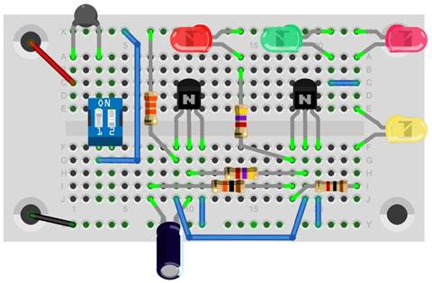 die gelbe LED, die gerade ohne Aufgabe ist. Tausche die Farben und probiere, ob