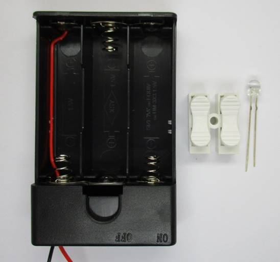 Hinter dem ersten Türchen findest du drei elektrische Bauteile, ein Batteriefach mit Anschlussdrähten, eine Doppelklemme und eine weiße Leuchtdiode (LED). Das Batteriefach hat einen abnehmbaren Deckel und einen Schiebeschalter mit den Stellungen ON (an) und OFF (aus). Das rote Kabel ist der Pluspol, das schwarze der Minuspol.