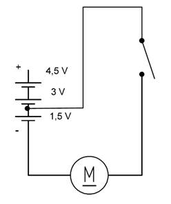 Halte die Drähte des Motors an eine einzelne Batteriezelle mit 1,5 V, dann entsteht tieferer Ton. Teste auch zwei Zellen in Reihe, also eine Spannung von 3 V. Der Ton wird deutlich höher als bei 1,5 V.
