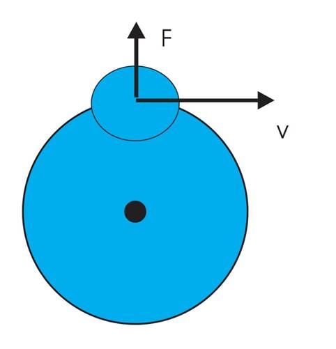 Genauso verhält es sich mit deiner Knetekugel auf der Motorachse. Betrachte einen Teil, der etwas nach außen ragt. Auf ihn wirkt die Fliehkraft F, weil er dauernd daran gehindert wird, in Richtung seiner momentanen Geschwindigkeit v geradeaus weiter zu fliegen. Aber wenn sich ein Teil löst, fliegt es tatsächlich in Richtung v davon. Also wenn du alles nur von oben betrachtest, kann die Knete dich nicht treffen.