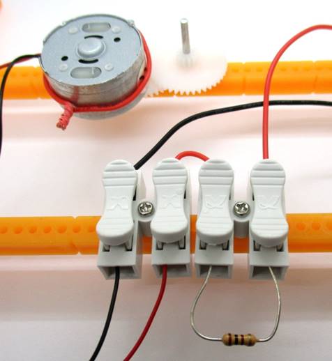 Nimm die Feder wieder ab und bauen den Getriebemotor auf. Schalte den Widerstand in Reihe zum Motor und schließe parallel dazu die rote LED an. Mit dem Widerstand wird der Strom durch den Motor geringer. Das merkt man besonders, wenn der Motor angehalten wird, dann mit dem Widerstand hat der Motor deutlich weniger Drehmoment.