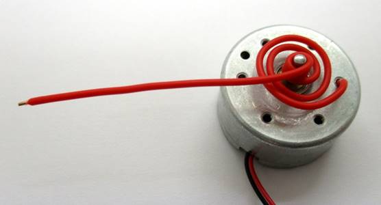Wickle zuerst drei Windungen eng um die Motorachse, wobei ein Ende von 3 cm als Zeiger gerade bleiben soll. Du kannst den Draht dann leicht von der Achse abziehen, weil die Wicklung sich durch ihre Federwirkung wieder etwas weitet. Sie soll aber für diesen Versuch ganz fest auf der Achse haften. Ziehe deshalb die Wicklung etwas lang, wodurch der Innendurchmesser kleiner wird. Drücke sie dann wieder auf die Achse, wo sie fest genug sitzt um den Motor anzuhalten.