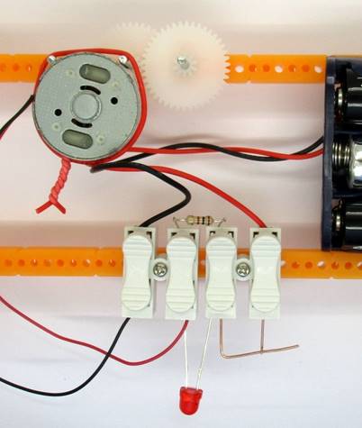 Schalte den Motor aus. Nun kannst du selbst den Motor in schnelle Drehungen versetzen, indem du das große Zahnrad mit den Fingern langsam drehst. Aber auch dazu ist mehr Kraft nötig. Die Motorachse dreht sich dann 16-fach schneller.