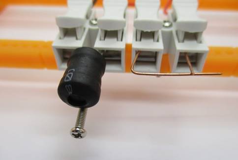 Der kürzere Draht hat 2 cm und bleibe gerade. Der längere Draht mit 4 cm wird in der Mitte gebogen. Die umgebogenen Enden bewirken einen besseren Halt in der Klemme. Beide Drähte werden so eingesetzt und gebogen, dass sie sich noch nicht berühren. Wenn aber mit dem Finger darauf drückt, wird die Verbindung hergestellt.