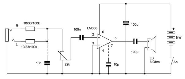 Stereo-Eingangsbuchse bis zum Lautsprecher. An einigen Stellen sind Variationen