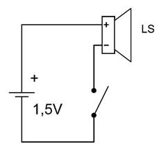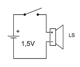 Der Lautsprecher hat einen Widerstand von 8 Ohm und eine maximale Leistung von 0,5 Watt. Eine ganz neue 1,5-V-Batterie kann tatsächlich etwa 1,6 V haben. Dann fließt ein Strom von 0,2 A. Die aufgenommene Leistung ist 0,32 W, liegt also noch unter dem erlaubten Grenzwert. In den späteren Versuchen wird sehr viel weniger Leistung aufgenommen. Aber schon mit wenigen Milliwatt erzeugt der Lautsprecher eine gute Lautstärke.