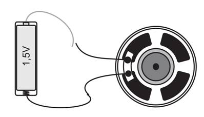 Das Lernpaket enthält ein Batteriefach für eine einzelne Mignonzelle. Setzen Sie eine 1,5-V-Zelle ein. Halten Sie die Drähte kurz an die des Lautsprechers. Es entsteht ein Knackgeräusch. Die Bewegung der Membran ist nur schwer zu sehen, kann aber mit dem Finger gefühlt werden. Je nach Anschlussrichtung wird die Membran durch den Strom nach innen oder nach außen gedrückt.