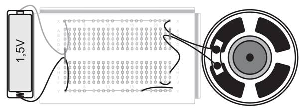 Nehmen Sie die Batterie heraus und verbinden Sie das Batteriefach auf der Steckplatine mit dem Lautsprecher. Die Zeichnung zeigt die inneren Verbindungen. Beim Einsetzen der Batterie entsteht wieder das bekannte Knacken. Nehmen Sie die Batterie nach einem kurzen Test wieder aus dem Batteriefach, um sie für die folgenden Versuche zu schonen.