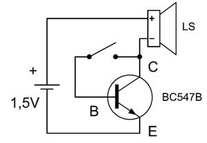 Bauen Sie einen Drahtschalter zwischen Basis und Kollektor. Bei geöffnetem Schalter fließt kein Strom durch den Transistor und den Lautsprecher. Wenn Sie die Batterie einsetzen entsteht deshalb kein Geräusch. Erst wenn Sie mit dem Schalter einen Basisstrom einschalten, hören Sie ein Knacken. Achtung, die Basis darf nur gegen den Kollektor kurzgeschlossen werden, aber auf keinen Fall gegen den Pluspol der Batterie.