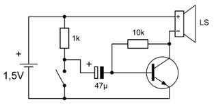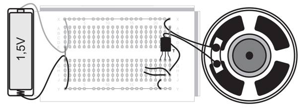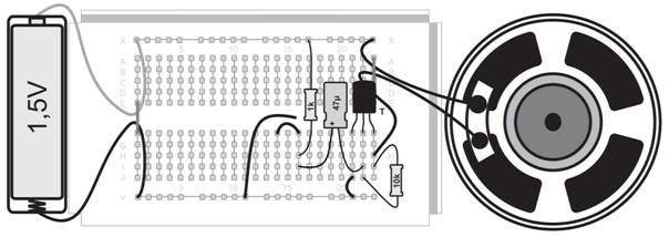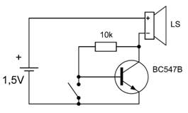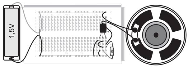 Ein Widerstand wird eingesetzt, um einen Strom zu verkleinern. In diesem Fall sorgt der Widerstand für einen Basisstrom von nur etwa 0,1 mA. Der Transistor verstärkt diesen kleinen Strom 300-fach bis auf etwa 30 mA. Zwischen Basis und Emitter des Transistors befindet sich ein Schalter. Wenn er geschlossen wird, leitet er den Basisstrom ab. Damit fließt auch kein Kollektorstrom mehr. Durch Öffnen und Schließen des Kontakts können Sie also ein Geräusch erzeugen.
