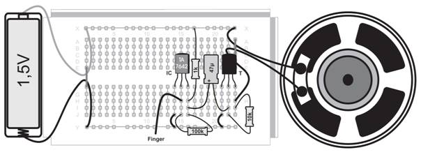 Bauen Sie aus zwei Drahtstücken einen Schalter. Jede Betätigung erzeugt dann ein Geräusch. Legen Sie den Lautsprecher auf die Schallöffnung des Gehäuses. Es wirkt dann wie ein Resonanzkörper oder eine Lautsprecherbox. Das Geräusch wird lauter.
