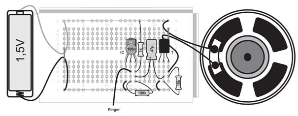 Berühren Sie den Eingang mit dem Finger. Wahrscheinlich hören Sie ein Brummen, Rauschen oder Prasseln. Eine Betätigung eines Lichtschalters im Raum sollte als Knacken hörbar werden. Die Schaltung ist damit bereits ein einfacher Hochfrequenzempfänger, der zumindest schon Funkstörungen aufnehmen kann.