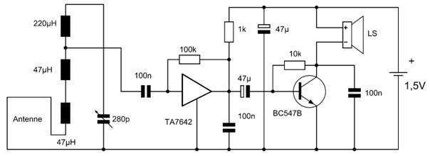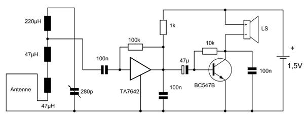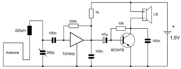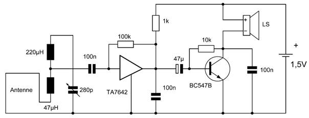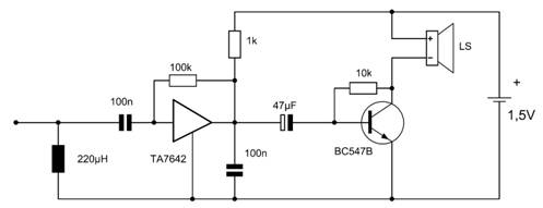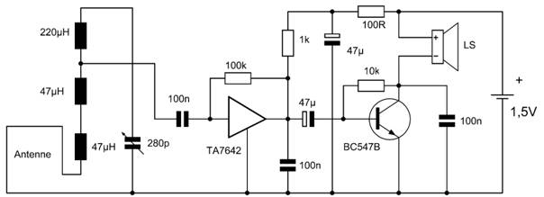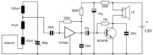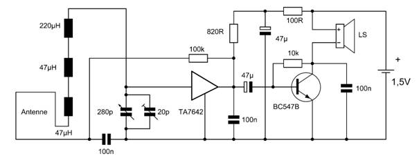 Ein weiterer wichtiger Faktor ist die Dämpfung des Schwingkreises durch unvermeidliche Verluste im Drahtwiderstand und im Ferritkern. Je mehr HF-Energie verloren geht, desto kleiner wird die Lautstärke und desto geringer wird die Trennschärfe. Das Empfänger-IC TA7642 liefert aber eine aktive Entdämpfung, d.h. ein Teil des verstärkten HF-Signals wird an den Schwingkreis zurückgekoppelt, um solche Verluste auszugleichen.