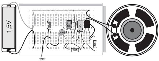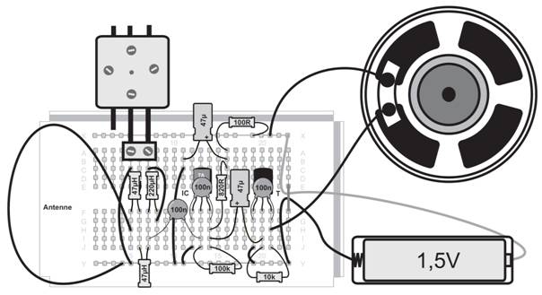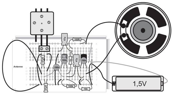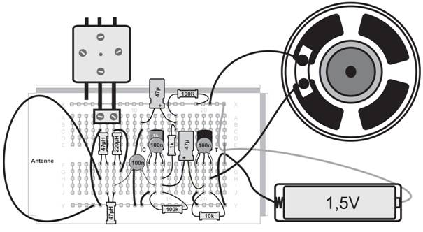 Bauen Sie diese Spule am Eingang des Empfängers ein. Sie bewirkt, dass NF-Signale kurzgeschlossen werden und nur HF-Signale an den Eingang gelangen. Der Empfang wird damit störungsfreier. Die Spule arbeitet hier als Filter. Ein weiterer Kondensator mit 100 nF wird als Koppelkondensator verwendet und lässt HF-Signale zum Eingang gelangen ohne den Eingangs-Gleichstrom abzuleiten. Wieder kann eine Berührung mit dem Finger eine Antenne ersetzen. Ihr Mittelwellen-Ortssender wird nun noch klarer empfangen.